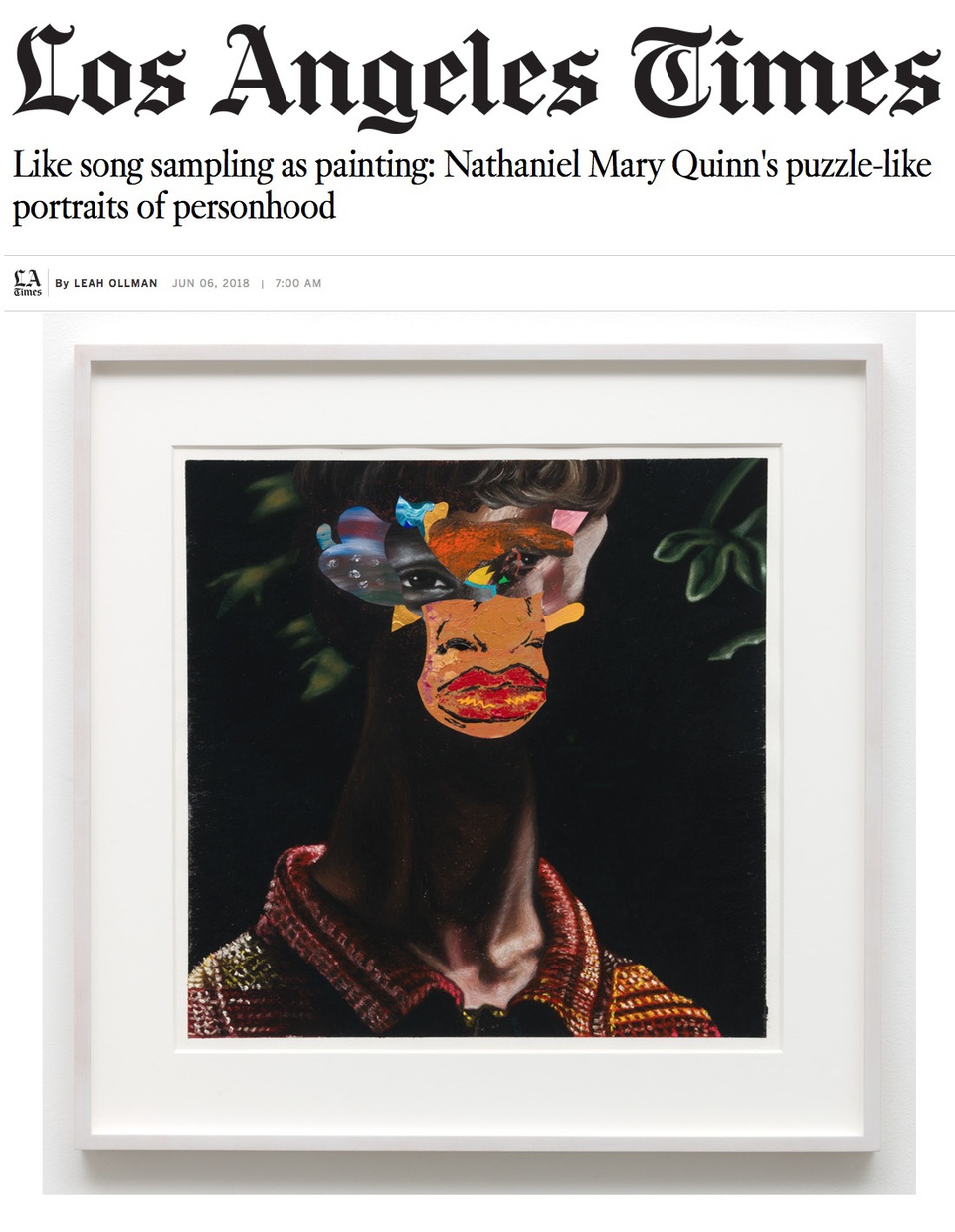 Nathaniel Mary Quinn’s Soundtrack reviewed by Leah Ollman for the Los Angeles Times • Nathaniel Mary Quinn's puzzle-like portraits of personhood • June 6, 2018
