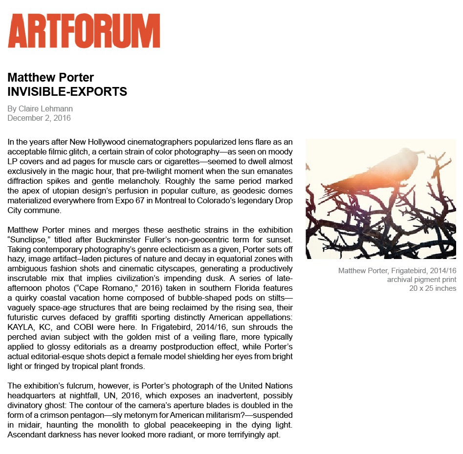 Artforum Critics' Picks reviews Matthew Porter's third exhibition at INVISIBLE-EXPORTS, "Sunclipse." • December 2, 2016
