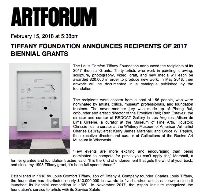 Jesse Stecklow: Tiffany Foundation Announces Recipients of 2017 Biennial Grants • February 15, 2018